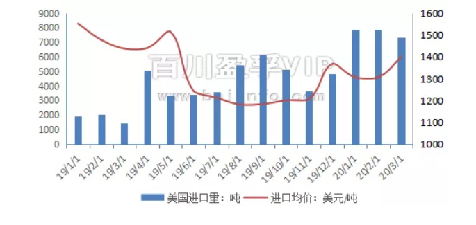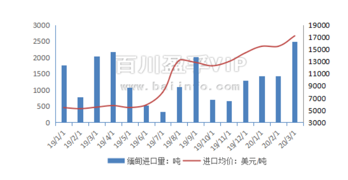 2020年3月混合碳酸稀土進口總量是586噸,環比上漲。其中緬甸進口量為565噸,環比上漲81%。進口均價為3241美元/噸,環比上漲11%。